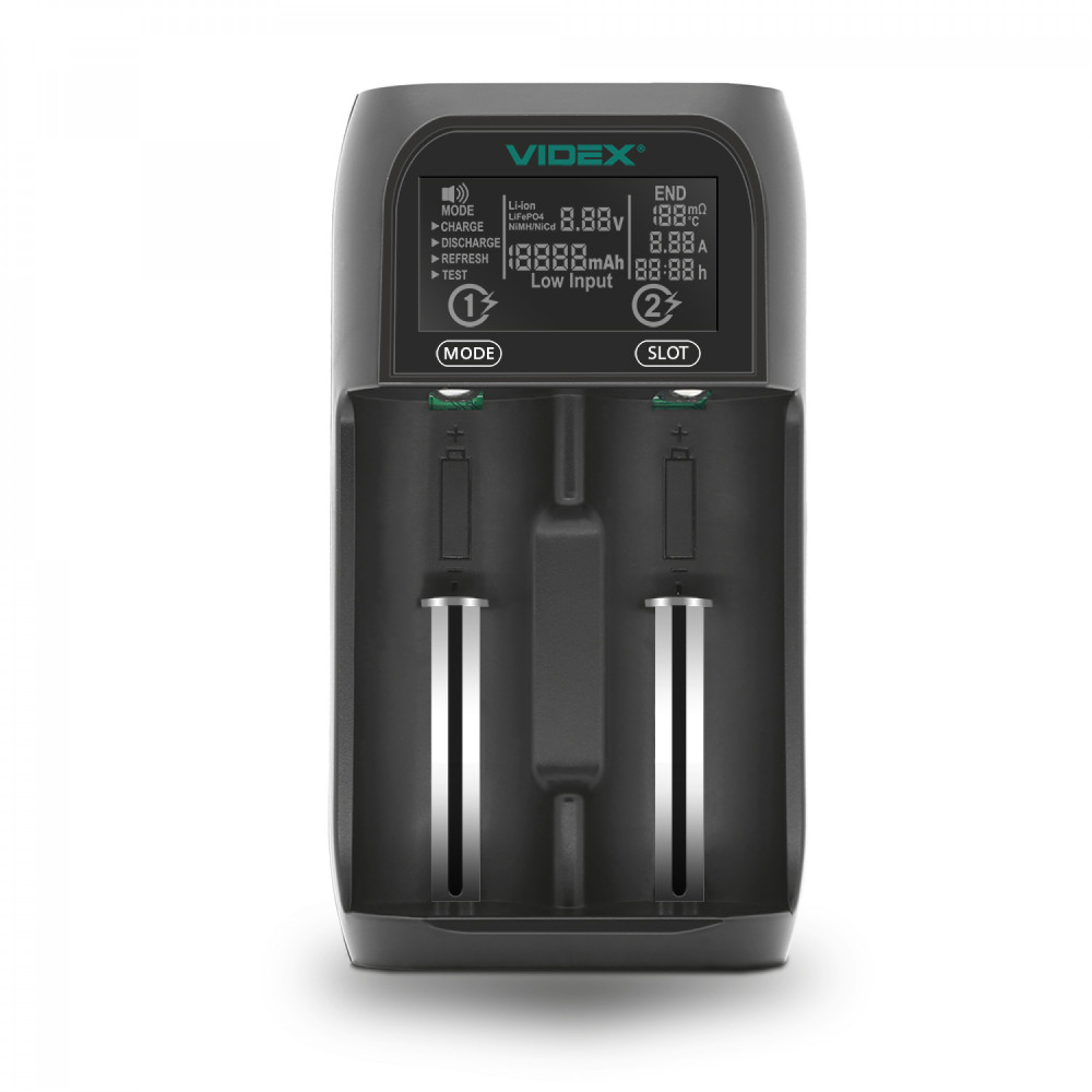 The charger is designed to safely recharge, discharge, test and recover rechargeable batteries. Charger for charging Ni-MH/Ni-Cd, Li-ion/MR/INR/ICR/LiFePO4 batteries. The charger case has a modern and ergonomic design, equipped with an LCD display and two independent channels for accumulators. The charger protects accumulators from short circuit, overcharge, overheating and incorrect polarity. With Li-ion/MR/INR/ICR and Ni-MH/Ni-Cd batteries, the device works in automatic mode and does not require monitoring during charging.
