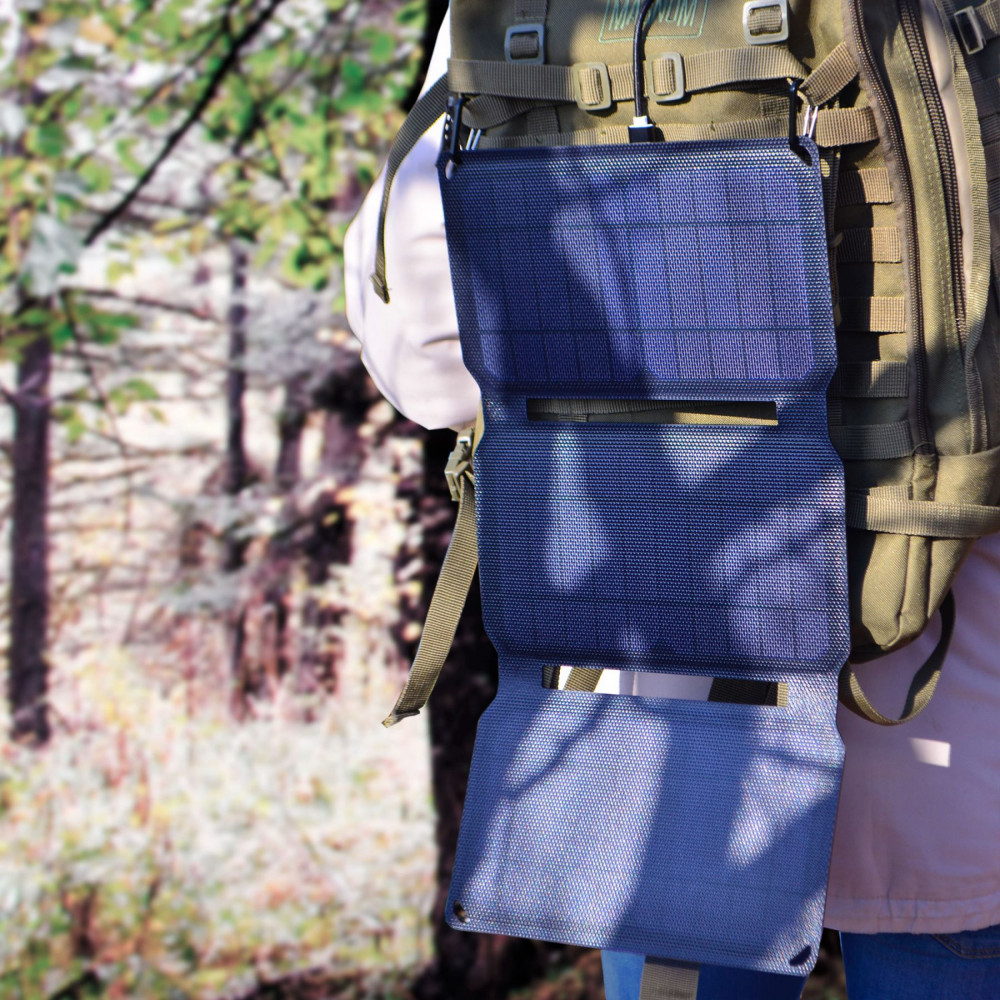 Unfold the solar panel in direct sunlight for 5 seconds. A red light indicates that sunlight has started to be converted into electricity. Connect the solar charger to the electronic device via the output power cable. A charging signal will be displayed on your electronic device.