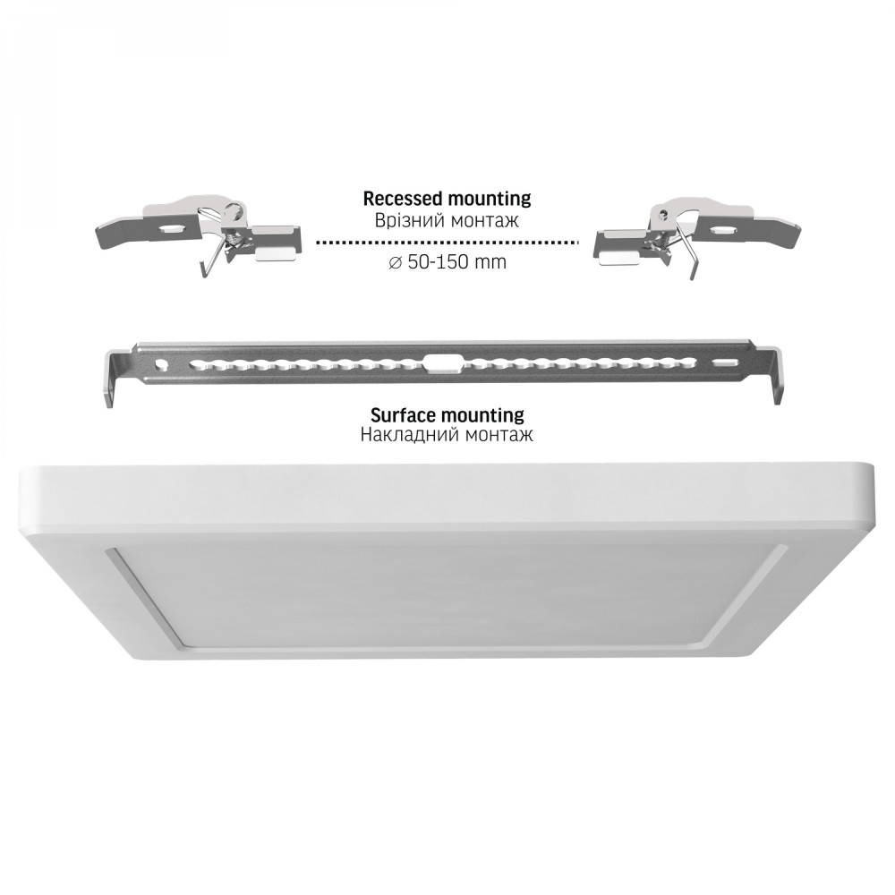 LED Ceiling Light VIDEX DL6S 18W 3000K-4000K-65000K is intended for general indoor lighting. It can be installed as a surface-mounted or recessed fixture. A key feature of this model is the ability to adjust the light color temperature according to your needs: - 3000K (warm light): creates a cozy, soft atmosphere; ideal for living rooms, cafés, restaurants, hotel rooms, or indoor relaxation areas. - 4000K (neutral white light): provides natural, balanced illumination; suitable for offices, corridors, schools, shops, and other public spaces. - 6500K (cold white light): recommended for utility, technical, or production areas where clarity and visual contrast are important. The light color temperature is set using the color temperature adjuster located on the back of the luminaire body, which can be moved to the corresponding mark for 3000K, 4000K, or 6500K. ADVANTAGES AND FEATURES: - number of ON/OFF cycles: 15 000 - luminous flux: 1850 Lm - efficiency: 103 Lm/W - beam angle: 140° - color temperature: 3000K / 4000K / 6500K - service life: 25 000 hours - minimum distance from illuminated object: 0.5 m - protection class: IP20 (for indoor use only) PACKAGE CONTENTS: 1) Luminaire 2) Bracket for surface mounting 3) Springs for recessed mounting 4) Mounting screws 5) User manual 6) Individual packaging INSTALLATION AND CONNECTION INSTRUCTIONS Before installation, carefully read the manual. Installation must be performed by a qualified specialist. Work should only be carried out with the power supply turned off. Please perform installation and connection according to the diagram provided in the manual. All work must be done with the power disconnected. Connection should be made using the built-in terminal block. Before first use, check the correctness of mechanical mounting and electrical connections. The luminaire can only be used with a power network that meets energy requirements and quality standards specified by law. This product should only be stored and used in dry indoor areas and protected from direct sunlight. WARNING! Do not look directly at the LED beam. Warranty – 2 years.