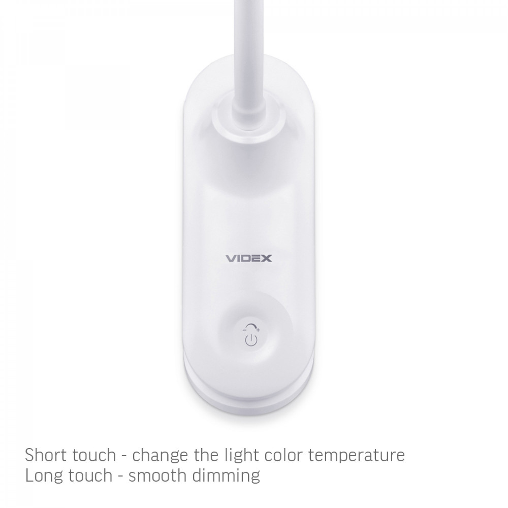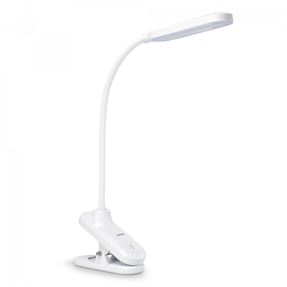 The LED table lamp VIDEX is an energy-efficient lighting device that can change the color temperature (3000K warm white, 4000K neutral white, 5500K almost cold white) and brightness (3 levels). Control is carried out with the help of one touch-sensitive button. A great choice for studying, reading or working in the office. The lamp can work both from the included adapter and from the USB port of the computer. The light of the lamp does not flicker and does not tire the eyes during long-term use. The lamp has a convenient clip for attaching it to the table or the edge of the bed.