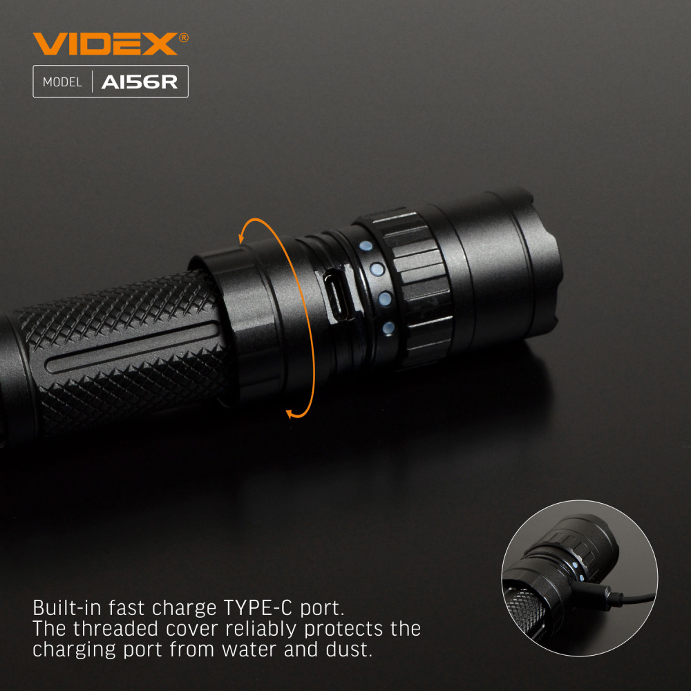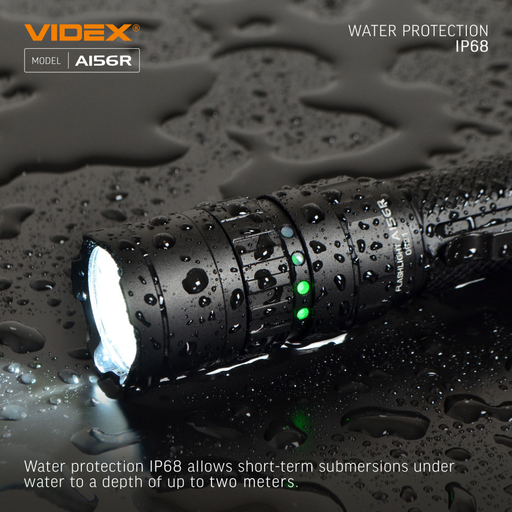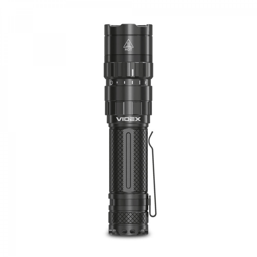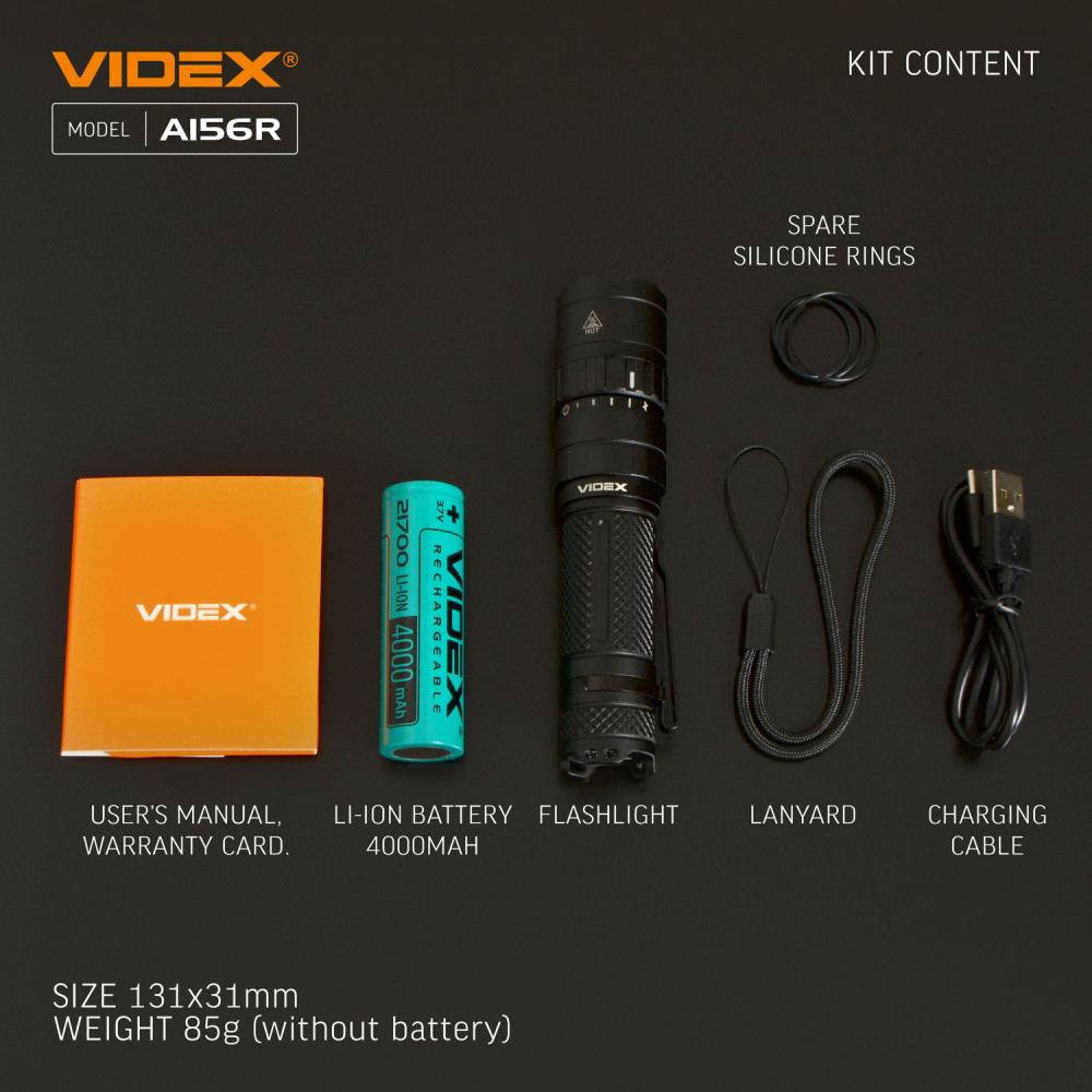LED Portable Flashlight VIDEX VLF-A156R 1700Lm 6500K is designed for individual use in the dark or in unlit indoor environments. The main features are water resistance, a durable housing, and long beam distance. The flashlight is equipped with a metal clip for convenient and secure attachment. It allows selecting the required operating mode. Maximum brightness is 1700Lm. It uses a Luminus SST40 LED, which improves the photoelectric conversion efficiency while achieving high reliability and better performance. The rotating mechanism of the upper part of the flashlight is used for turning it on/off and switching between modes. Flashlight operating modes: TURBO (Turbo mode) – with the highest light brightness of 1700Lm. The illumination distance is 210m. Operating time is 2h 45min. Light intensity is 10960cd. The TURBO mode runtime is the total time tested with overheating protection enabled. HIGH (Maximum light power mode) – light brightness of 770Lm. The illumination distance is 155m. Operating time is 3h. Light intensity is 6000cd. MIDDLE (Medium light power mode) – light brightness of 480Lm. The illumination distance is 135m. Operating time is 5h. Light intensity is 4560cd. LOW (Minimum light power mode) – light brightness of 160Lm. The illumination distance is 87m. Operating time is 17h 50min. Light intensity is 1900cd. STROBE (Strobe) – rapidly produces repeated bright light pulses. The discharge time was tested with the standard 21700 4000mAh battery and may be extended when using a higher-capacity battery. The above parameters may vary depending on environmental conditions. Flashlight charge level: It has 4 LED indicators on the housing that indicate the flashlight’s charge level. Each LED indicator represents approximately 25% of charge. 4 green indicators on – charge level from 100% to 75%; 3 green indicators on – charge level from 74% to 50%; 2 green indicators on – charge level from 49% to 25%; 1 green indicator on – charge level from 24% to 10%; 1 red indicator on – charge level from 9% to 1% (critically low). Charging is available via a USB-C cable. To open the USB port, turn it counterclockwise. Li-ion 21700 batteries are used as the power source. The approximate charging time is up to 2.5 hours. ATTENTION! It is strictly prohibited to use the flashlight while charging. Perfectly protected and adapted for use in difficult and extreme conditions. It easily withstands mechanical loads and drops from height. It can fall from a height of 1m without being damaged. The flashlight is fully dustproof and can withstand short-term immersion in water to a depth of up to 2m. Protection rating – IP68 (2m underwater). An excellent, modern, highly efficient flashlight will be a perfect companion during outdoor activities. Convenient to use. Warranty is 3 years for the flashlight and 1 year for the battery.