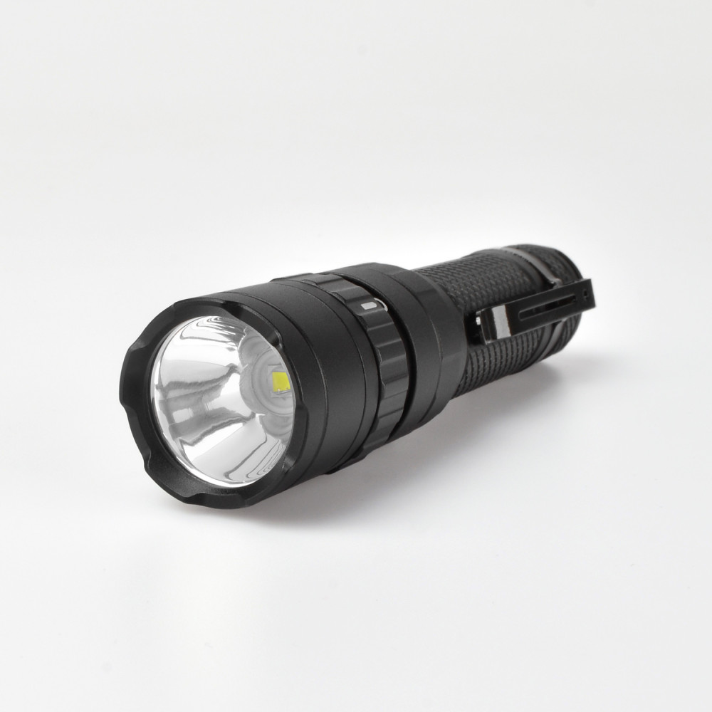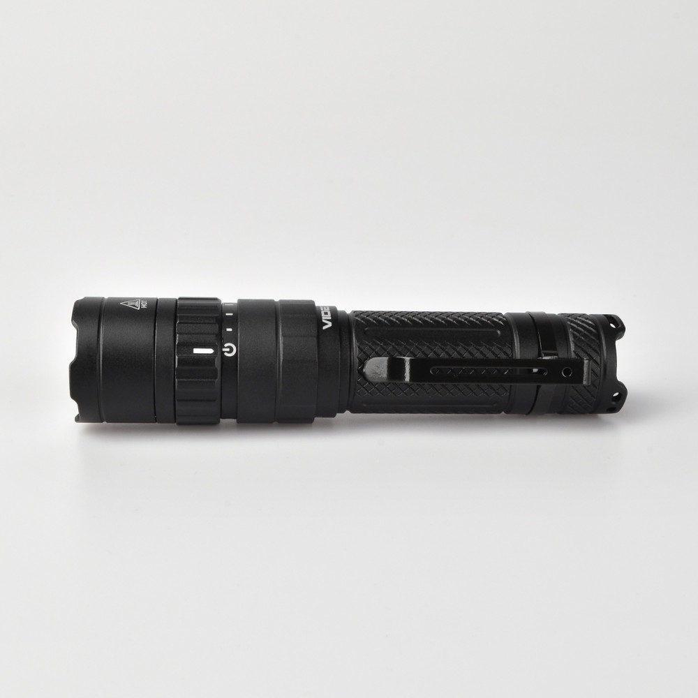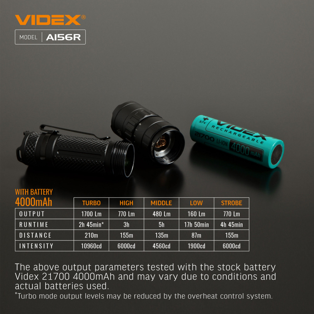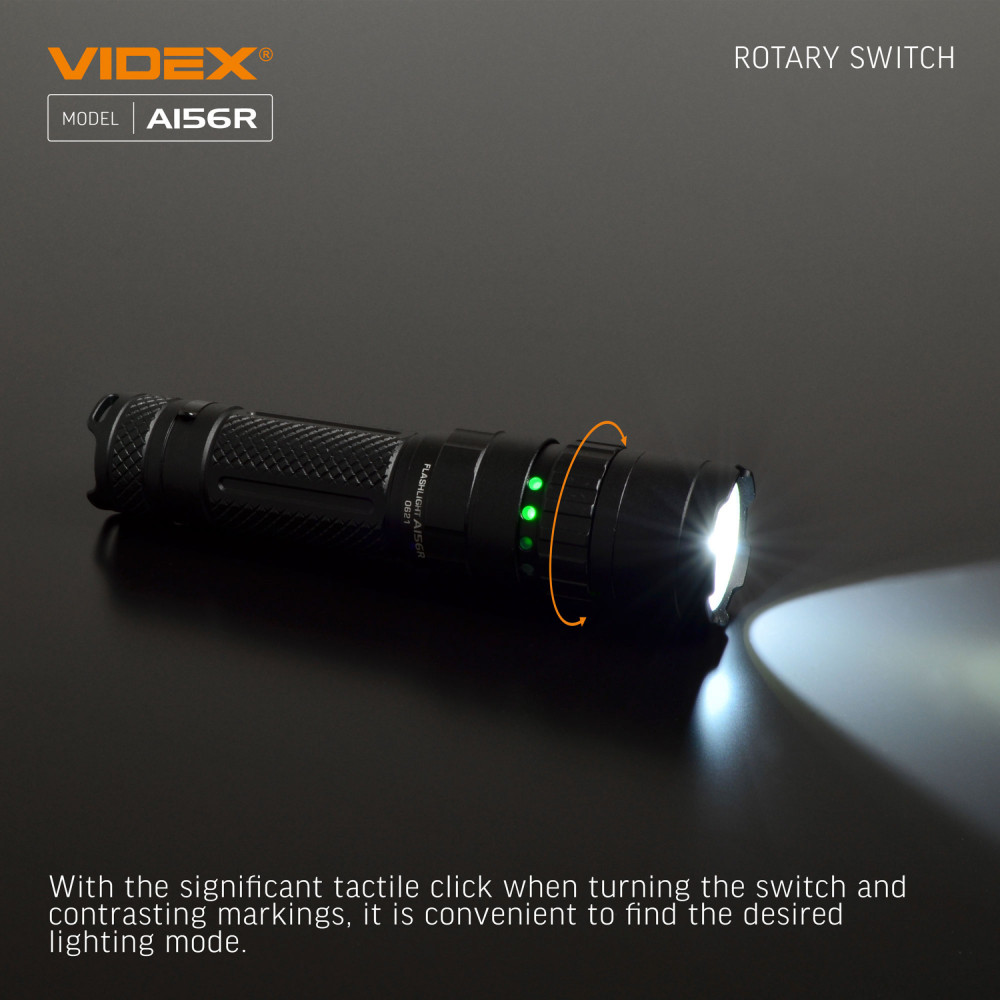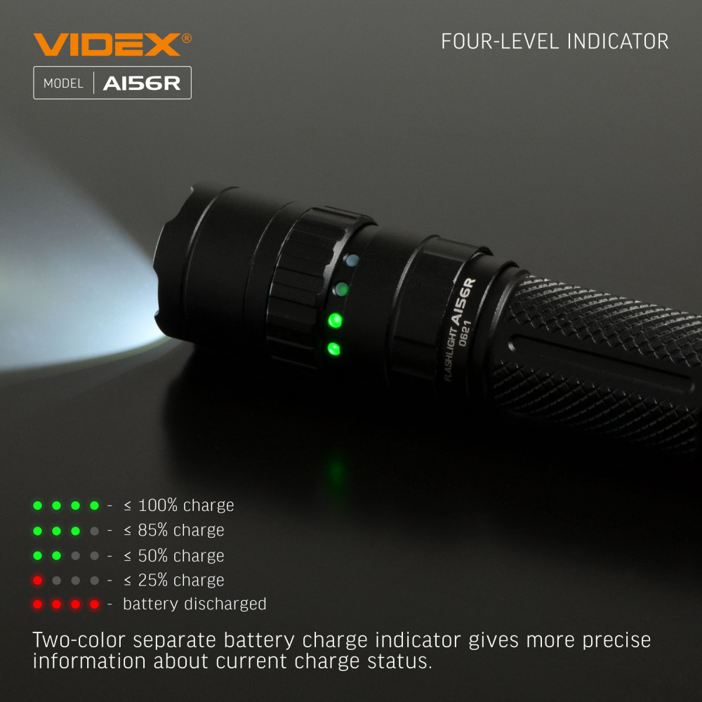 LED Portable Flashlight VIDEX VLF-A156R 1700Lm 6500K is designed for individual use in the dark or in unlit indoor environments. The main features are water resistance, a durable housing, and long beam distance. The flashlight is equipped with a metal clip for convenient and secure attachment. It allows selecting the required operating mode. Maximum brightness is 1700Lm. It uses a Luminus SST40 LED, which improves the photoelectric conversion efficiency while achieving high reliability and better performance. The rotating mechanism of the upper part of the flashlight is used for turning it on/off and switching between modes. Flashlight operating modes: TURBO (Turbo mode) – with the highest light brightness of 1700Lm. The illumination distance is 210m. Operating time is 2h 45min. Light intensity is 10960cd. The TURBO mode runtime is the total time tested with overheating protection enabled. HIGH (Maximum light power mode) – light brightness of 770Lm. The illumination distance is 155m. Operating time is 3h. Light intensity is 6000cd. MIDDLE (Medium light power mode) – light brightness of 480Lm. The illumination distance is 135m. Operating time is 5h. Light intensity is 4560cd. LOW (Minimum light power mode) – light brightness of 160Lm. The illumination distance is 87m. Operating time is 17h 50min. Light intensity is 1900cd. STROBE (Strobe) – rapidly produces repeated bright light pulses. The discharge time was tested with the standard 21700 4000mAh battery and may be extended when using a higher-capacity battery. The above parameters may vary depending on environmental conditions. Flashlight charge level: It has 4 LED indicators on the housing that indicate the flashlight’s charge level. Each LED indicator represents approximately 25% of charge. 4 green indicators on – charge level from 100% to 75%; 3 green indicators on – charge level from 74% to 50%; 2 green indicators on – charge level from 49% to 25%; 1 green indicator on – charge level from 24% to 10%; 1 red indicator on – charge level from 9% to 1% (critically low). Charging is available via a USB-C cable. To open the USB port, turn it counterclockwise. Li-ion 21700 batteries are used as the power source. The approximate charging time is up to 2.5 hours. ATTENTION! It is strictly prohibited to use the flashlight while charging. Perfectly protected and adapted for use in difficult and extreme conditions. It easily withstands mechanical loads and drops from height. It can fall from a height of 1m without being damaged. The flashlight is fully dustproof and can withstand short-term immersion in water to a depth of up to 2m. Protection rating – IP68 (2m underwater). An excellent, modern, highly efficient flashlight will be a perfect companion during outdoor activities. Convenient to use. Warranty is 3 years for the flashlight and 1 year for the battery.