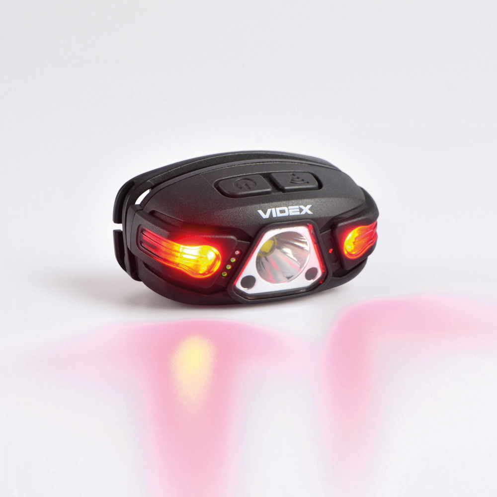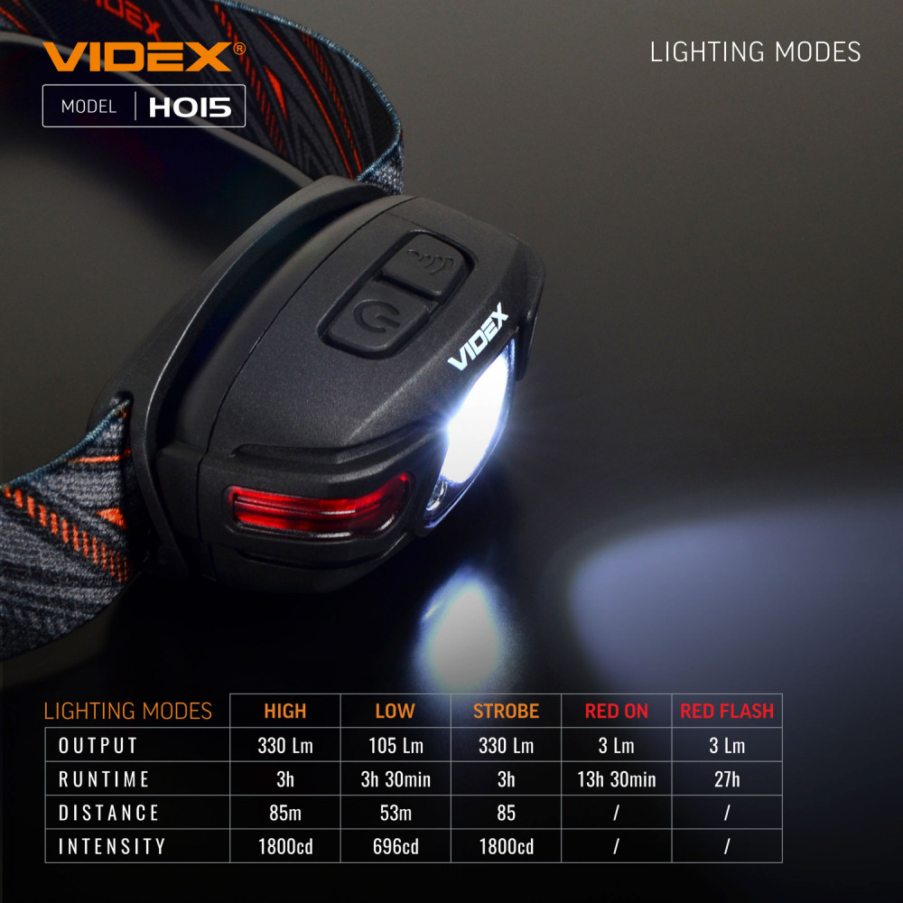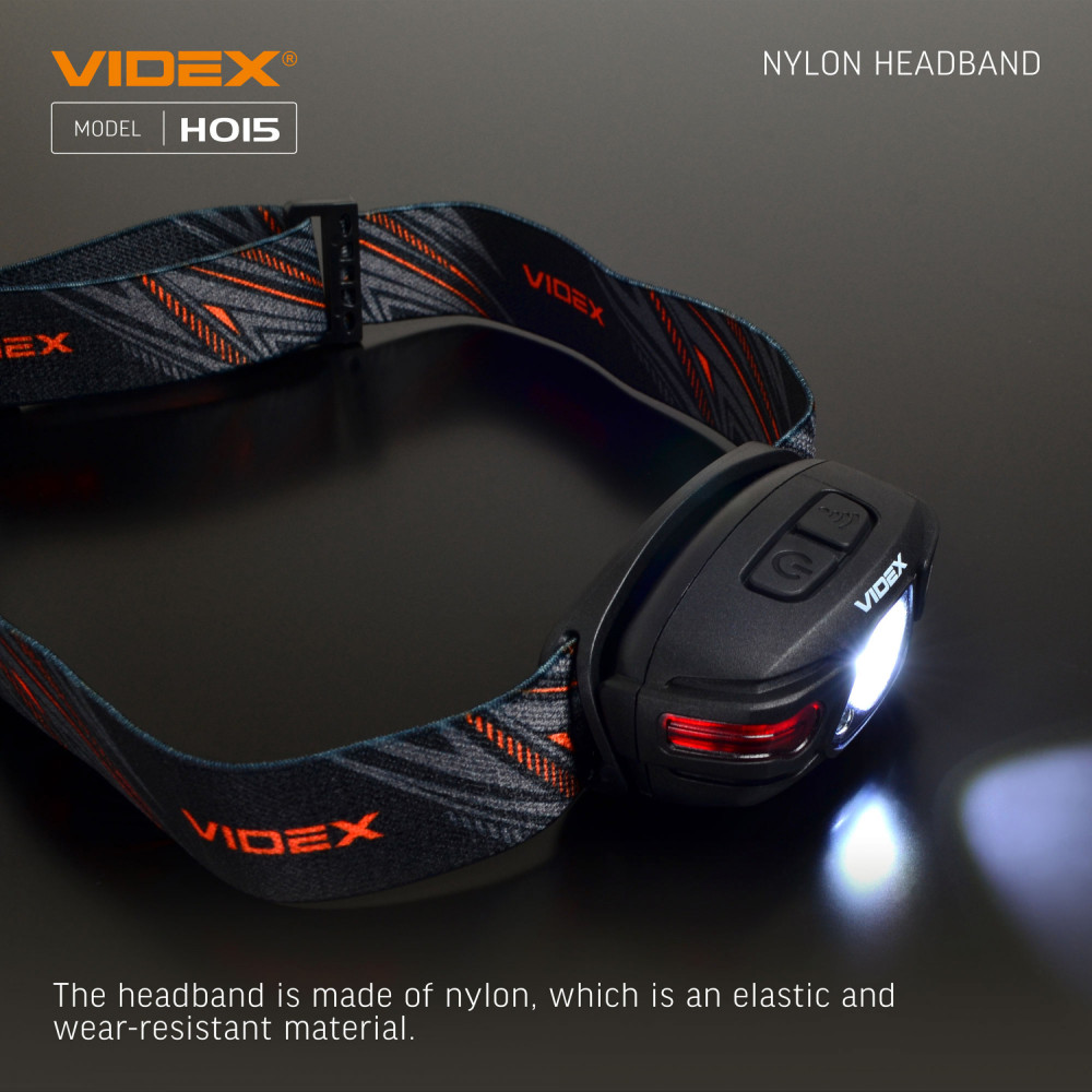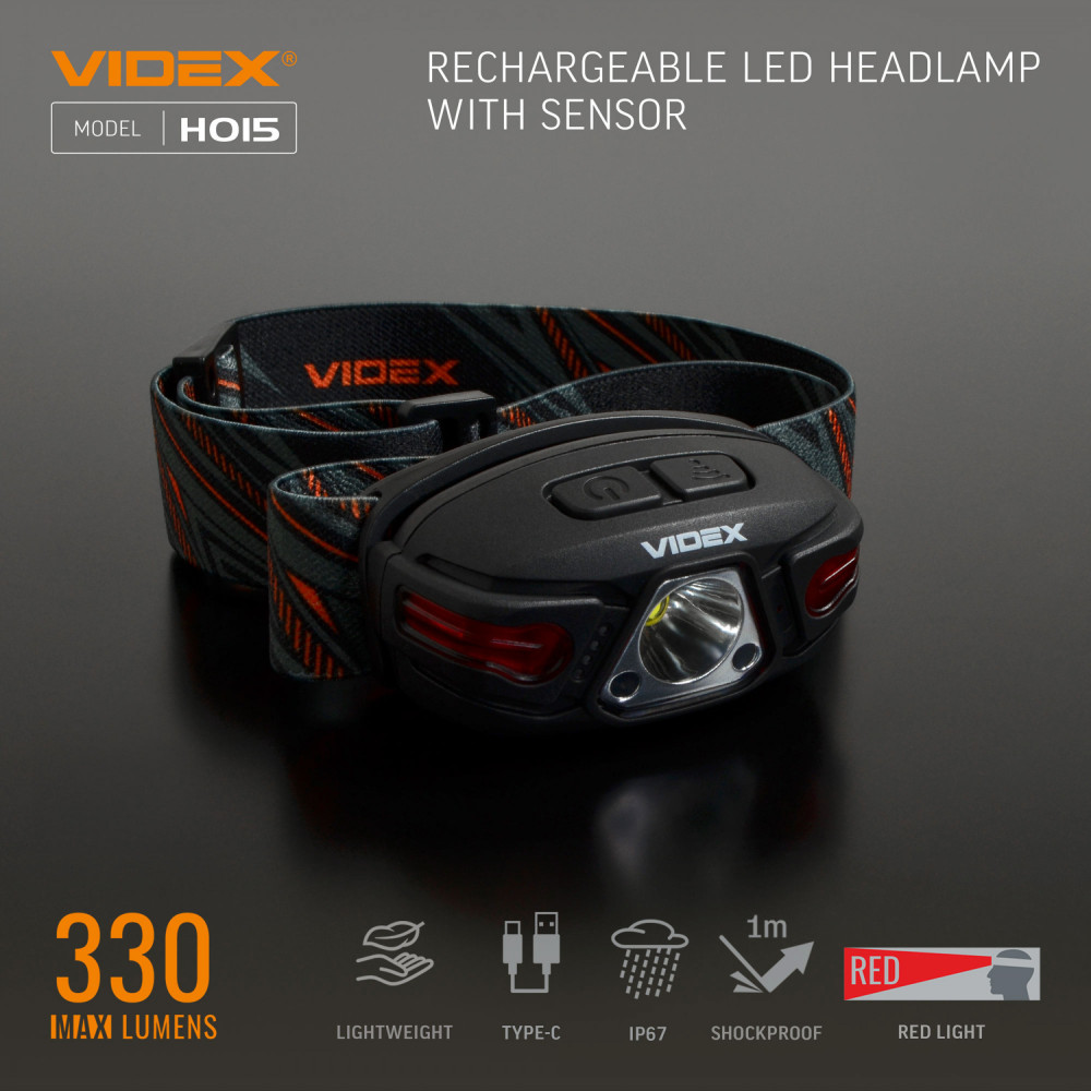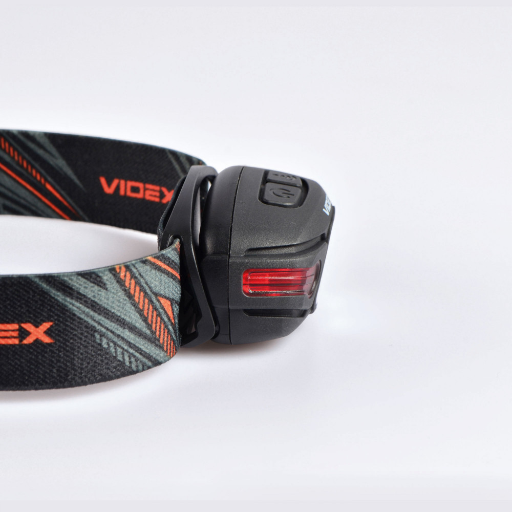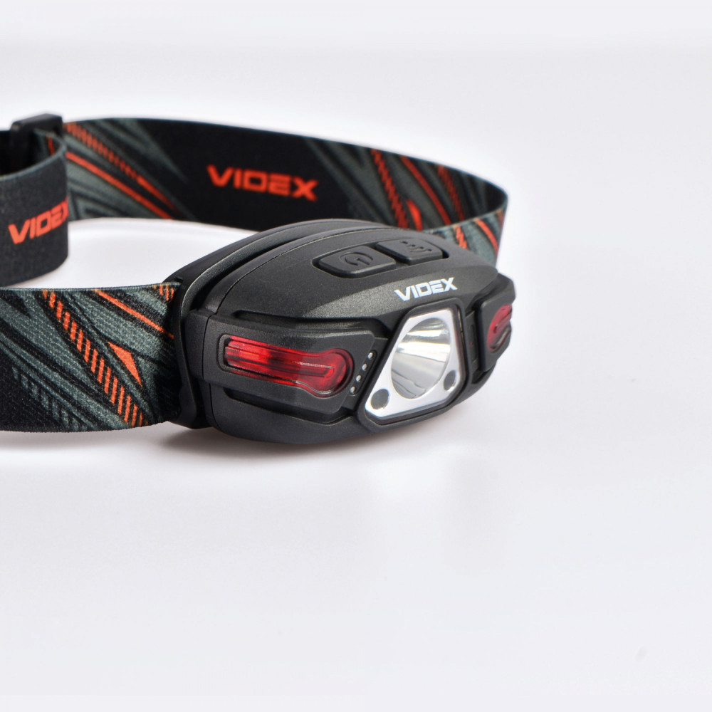 LED Headlamp VIDEX VLF-H015 330Lm 5000K is designed for individual use in the dark or in indoor environments without lighting. Its main features include water resistance, a reliable housing, and long beam distance. It allows the user to select the required operating mode. Maximum brightness is 330 Lm. The adjustable tilt angle of the mount allows you to choose a convenient lighting angle. The headlamp uses a headband made of wear-resistant, soft-textured material, ensuring comfortable use. Sensor control: The headlamp can be operated using a motion sensor. The sensor button allows you to turn the headlamp on and control its modes with hand gestures. A long press of any button turns the headlamp off. A short press of the function button allows you to switch between operating modes. Operating modes: HIGH (white light, maximum output) – brightness 330Lm. Beam distance up to 85m. Operating time 3h. Luminous intensity 1800cd. LOW (white light, minimum output) – brightness 105Lm. Beam distance up to 53m. Operating time 3h 30min. Luminous intensity 696cd. FLASH – white flashing light mode. Brightness 330Lm. Beam distance up to 85m. Operating time 3h. Luminous intensity 1800cd. RED ON – red light, maximum output. Brightness 3Lm. Operating time 13h 30min. RED FLASH – red flashing light. Brightness 3Lm. Operating time 27h. Battery charge level: When fully charged, all four indicators light up green. Charging is available via USB-C. WARNING! Using the headlamp while charging is strictly prohibited. The headlamp is powered by a built-in 850 mAh lithium-polymer battery. The built-in battery may be replaced independently only after the warranty period has expired. The replacement process is described in the manual. Please note that replacing the battery during the warranty period will void the warranty. The headlamp is well protected and adapted for use in harsh and extreme conditions. It easily withstands mechanical stress and drops from a height of up to 1m without damage. It is fully protected against dust, heavy rain, and splashes. Ingress protection is IP67 (submersion up to 1m). The headband is made of thin, breathable material and features a silicone mount for the headlamp. Please also note that this model includes a lock function to prevent accidental activation. It is activated by pressing and holding the function button and the sensor button simultaneously for 3 seconds, and deactivated in the same way. This excellent, modern, high-efficiency headlamp will be a perfect companion for outdoor activities. Easy to use. Warranty is 2 years.