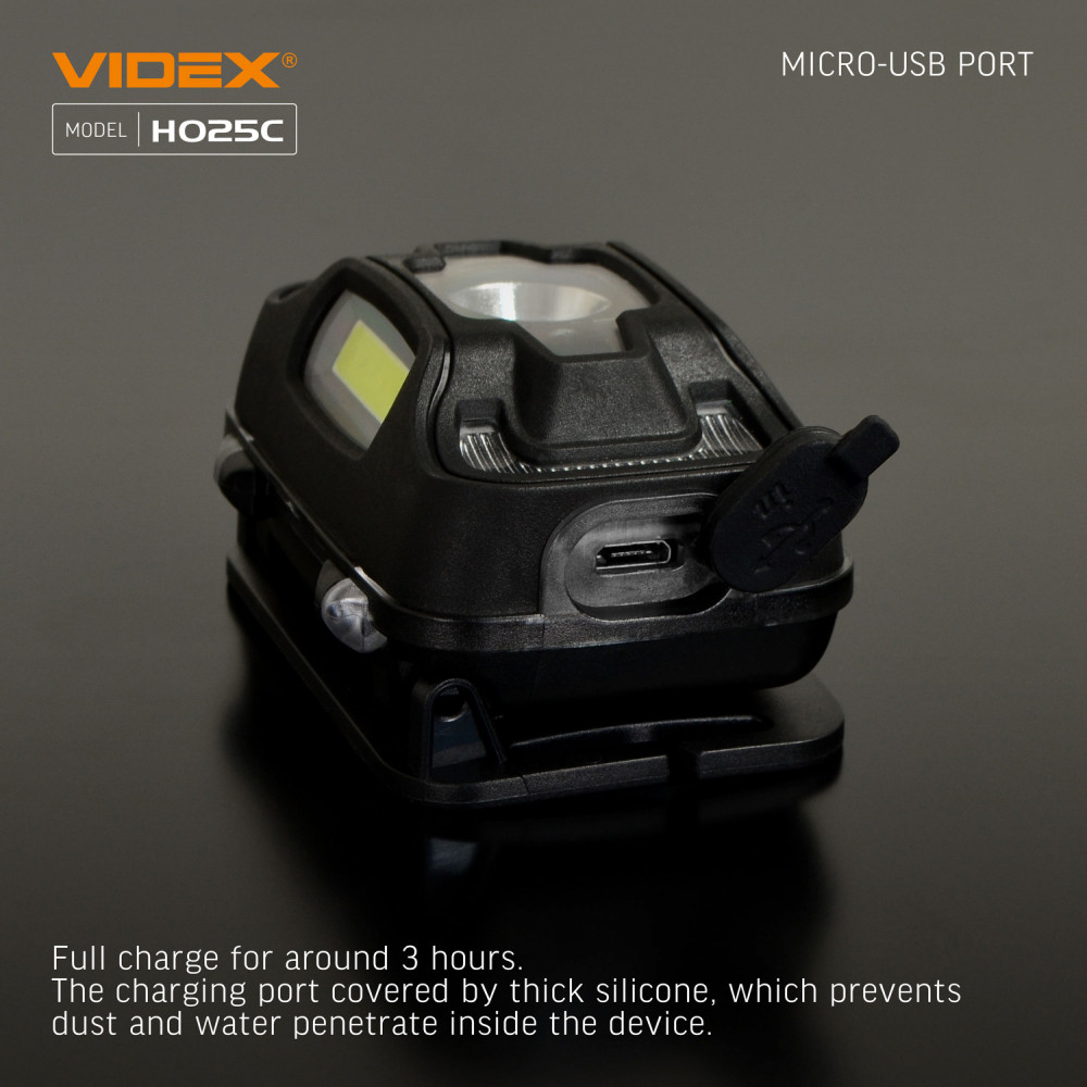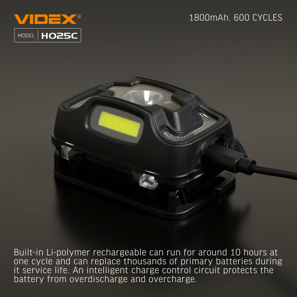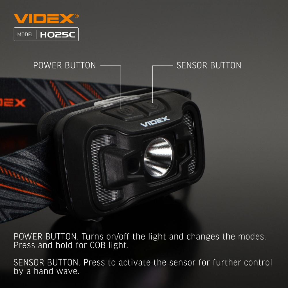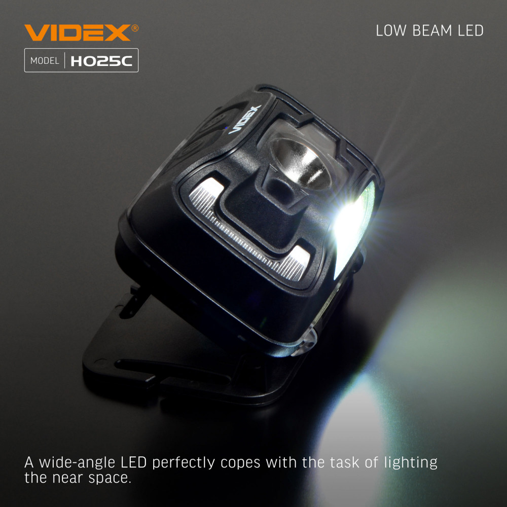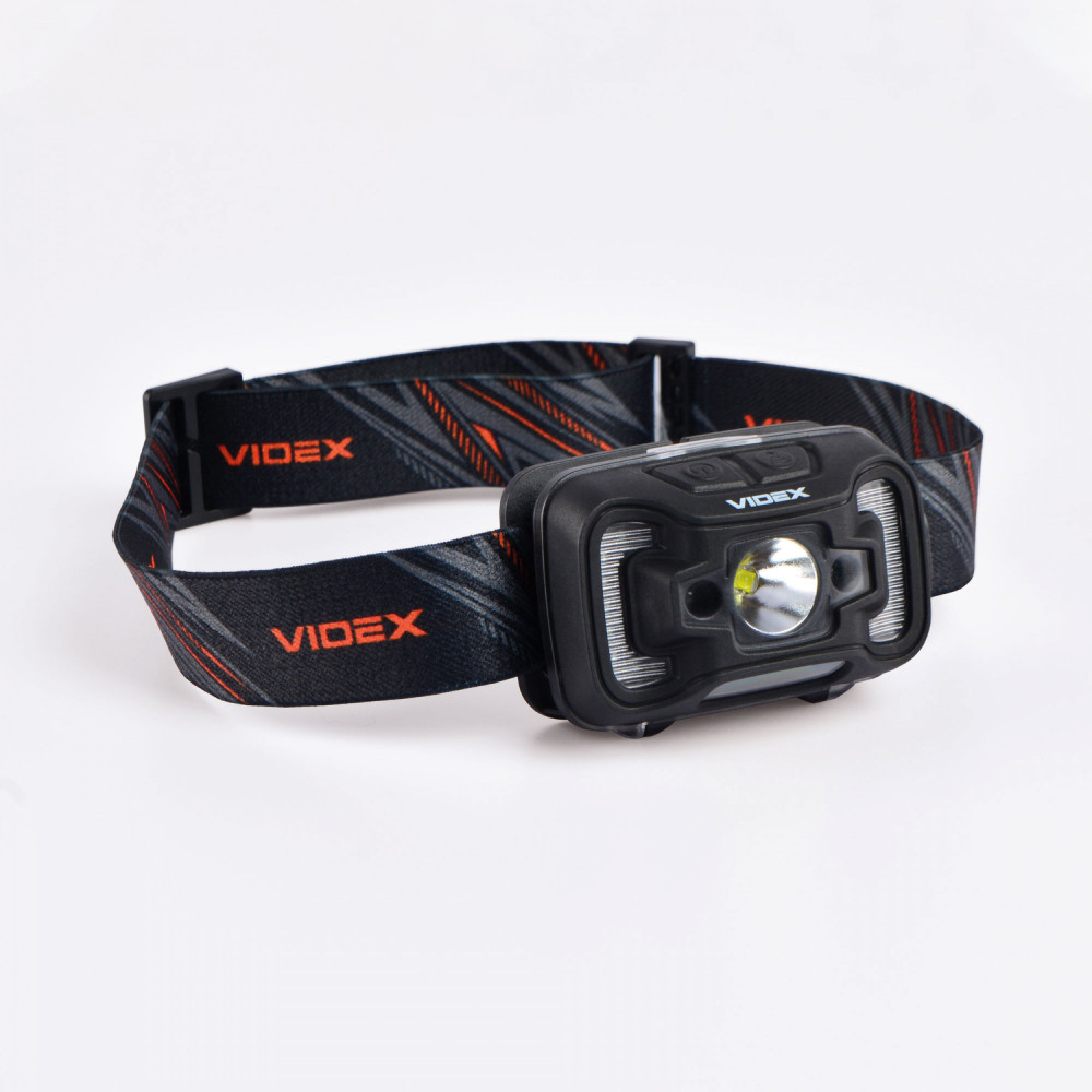 LED Headlamp VIDEX VLF-H025C 310Lm 5000K is designed for individual use in the dark or in unlit indoor environments. Its main features include water resistance, a reliable housing, and long beam distance. It allows the user to select the required operating mode. The maximum brightness is 310Lm. The adjustable tilt angle of the mount allows you to choose a convenient lighting angle. A built-in motion sensor ensures convenient switching on. The headlamp is equipped with a headband made of wear-resistant, soft-textured material, ensuring comfortable use. The sensor button allows you to turn on the blue light and control its modes using hand gestures. A long press of the sensor button displays the battery charge level. A short press of the functional button allows switching between operating modes. The modes must be changed within 3 seconds; otherwise, the headlamp turns off. Operating modes: HIGH (white light, maximum output) – brightness 250Lm. Beam distance up to 74m. Operating time 4h 50min. Luminous intensity 1380cd. LOW (white light, minimum output) – brightness 95Lm. Beam distance up to 46m. Operating time 9h. Luminous intensity 520cd. COB (uniform diffused light at 120°, close-range lighting) – brightness 75Lm. Beam distance up to 7m. Operating time 10h 20min. Luminous intensity 12cd. COB + HIGH (uniform diffused light at 120°, close-range lighting at maximum output) – brightness 310Lm. Beam distance up to 74m. Operating time 3h. Luminous intensity 1380cd. FLASH – white flashing light mode. Brightness 95Lm. Beam distance up to 46m. Operating time 21h. Luminous intensity 520cd. RED ON – red light at maximum output. Brightness 1.2Lm. Operating time 8h. RED FLASH – red flashing light. Brightness 1.2Lm. Operating time 16h. Battery charge level: - During charging, the indicators flash red. - When fully charged, the indicators light up red. USB-C charging is supported. WARNING! It is strictly prohibited to use the headlamp while charging. The headlamp is powered by a built-in 1800mAh lithium-polymer battery. The built-in battery may be replaced independently only after the warranty period has expired. The replacement process is described in the user manual. Please note that replacing the battery independently during the warranty period will void the warranty. The headlamp is well protected and adapted for use in harsh and extreme conditions. It easily withstands mechanical stress and drops from a height of up to 1m without damage. It provides full protection against dust, heavy rain, and splashes. The protection rating is IP65. The headband is made of thin, breathable material with a silicone mount for the headlamp. This modern, high-efficiency headlamp is an excellent companion for outdoor activities. Easy to use. Warranty is 2 years.
