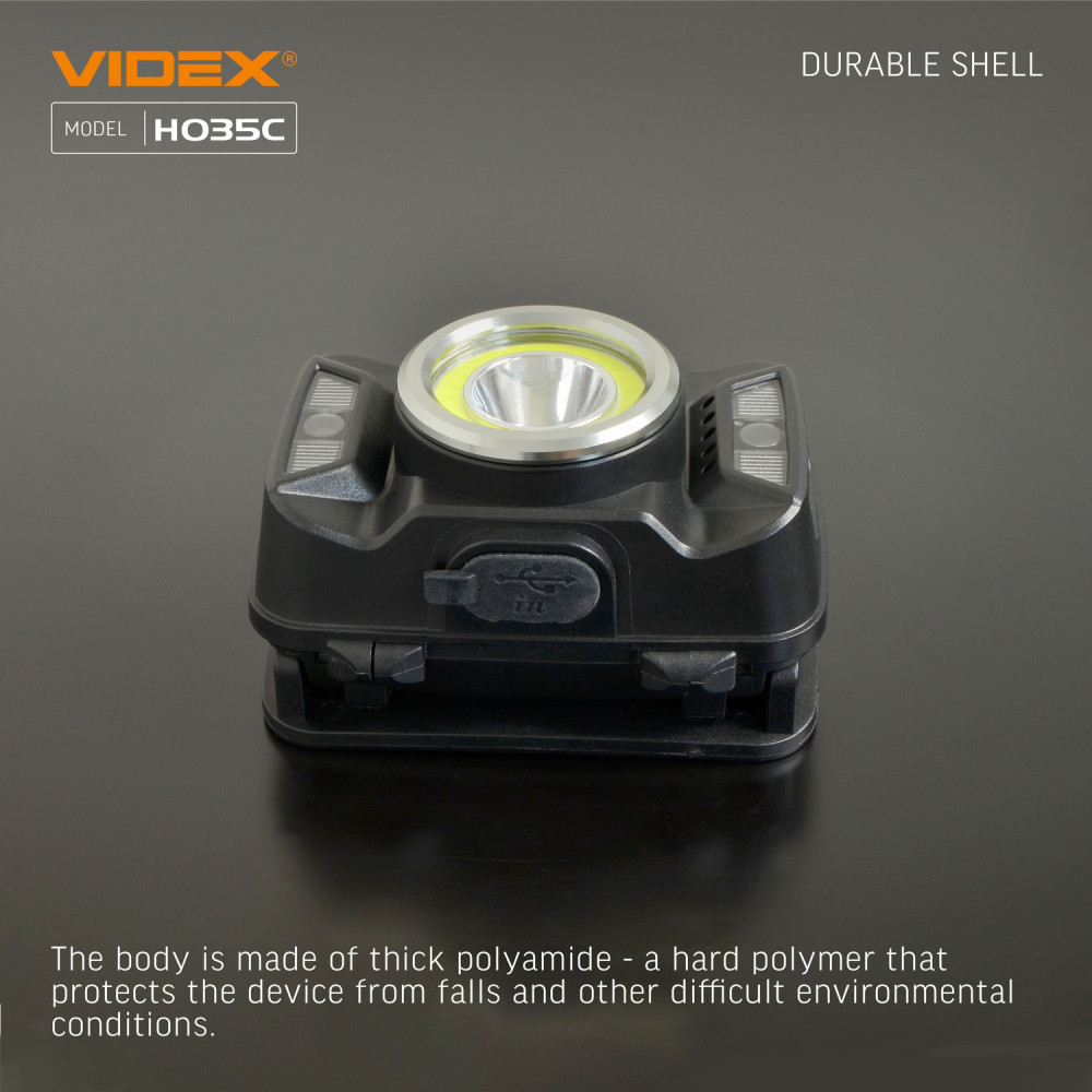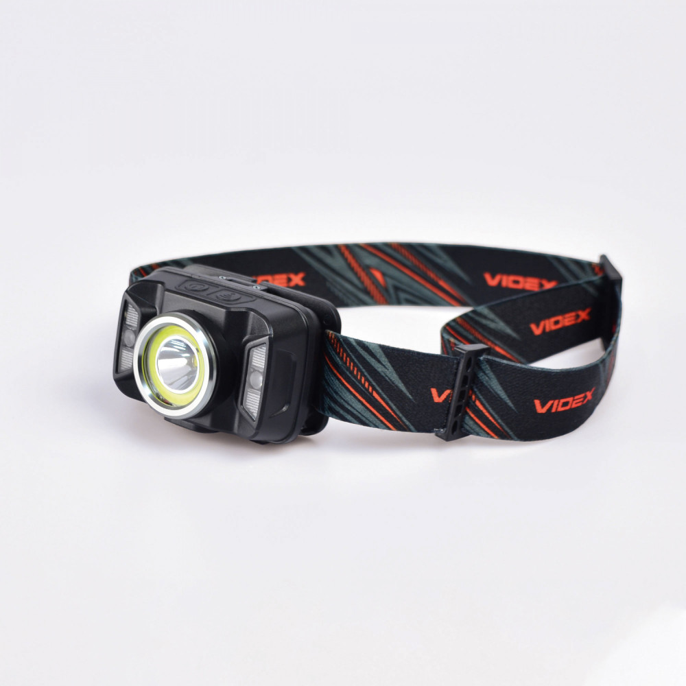 LED Headlamp VIDEX VLF-H035C 410Lm 5000K is designed for individual use in the dark or in unlit indoor environments. Its main features include water resistance, a reliable housing, and long beam distance. It allows the user to select the required operating mode. The maximum brightness is 410Lm. The adjustable tilt angle of the mount allows you to choose a convenient lighting angle. The headlamp is equipped with a headband made of wear-resistant, soft-textured material, ensuring comfortable use. The flashlight can be controlled using a motion sensor. The sensor button allows you to turn the flashlight on and control its modes with hand gestures. A long press of the sensor button displays the battery charge level. A short press of the functional button allows switching between operating modes. Modes can be changed within 3 seconds; otherwise, the flashlight turns off. Operating modes: HIGH (white light, maximum output) – brightness 340Lm. Beam distance up to 86m. Operating time 3h 30min. Luminous intensity 1840cd. LOW (white light, minimum output) – brightness 140Lm. Beam distance up to 53m. Operating time 7h. Luminous intensity 692cd. COB (uniform diffused light at 120°, close-range lighting) – brightness 230Lm. Beam distance up to 14m. Operating time 3h 30min. Luminous intensity 50cd. COB + HIGH (uniform diffused light at 120°, close-range lighting at maximum output) – brightness 410Lm. Beam distance up to 86m. Operating time 2h 20min. Luminous intensity 1840cd. FLASH – white flashing light mode. Brightness 140Lm. Beam distance up to 53m. Operating time 5h 30min. Luminous intensity 692cd. RED ON – red light at maximum output. Brightness 2.5Lm. Operating time 11h. RED FLASH – red flashing light. Brightness 2.5Lm. Operating time 23h. Battery charge level: When fully charged, all 5 indicators light up blue. USB-C charging is supported. WARNING! It is strictly prohibited to use the flashlight while charging. The flashlight is powered by a built-in 1800mAh lithium-polymer battery. The built-in battery may be replaced independently only after the warranty period has expired. The replacement process is described in the user manual. Please note that replacing the battery самостоятельно during the warranty period will void the warranty. The headlamp is well protected and adapted for use in harsh and extreme conditions. It easily withstands mechanical stress and drops from a height of up to 1m without damage. It provides full protection against dust, heavy rain, and splashes. Ingress protection is IP65. The headband is made of thin, breathable material with a silicone mount for the flashlight. This modern, high-efficiency headlamp is an excellent companion for outdoor activities. Easy to use. Warranty is 2 years.
