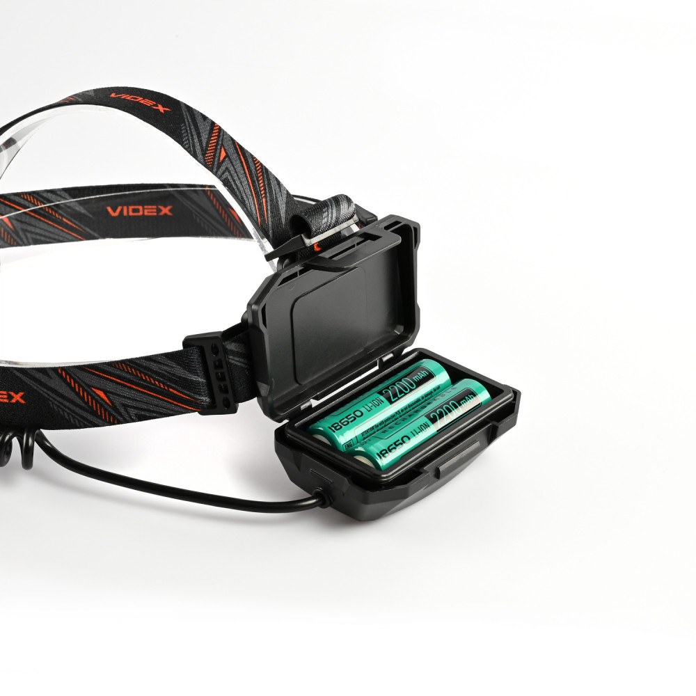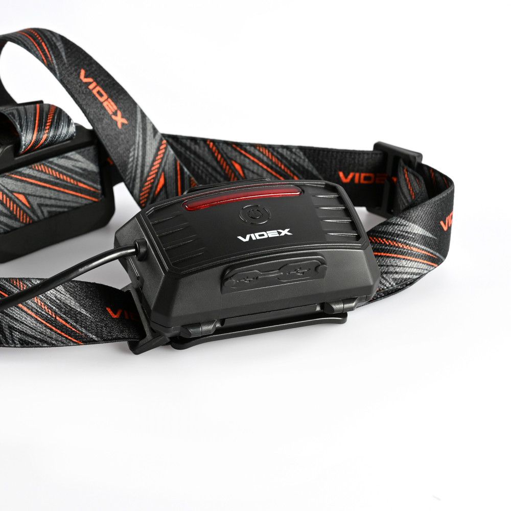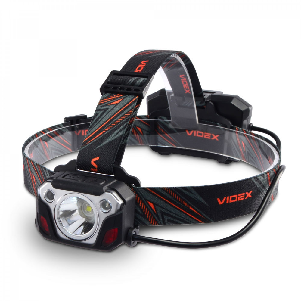 LED Headlamp VIDEX VLF-H056 1400Lm 6500K is designed for personal use in the dark or in unlit indoor environments. Its main features are water resistance, a durable body, and long-range illumination. The headlamp allows the user to select the required operating mode. Maximum brightness is 1400Lm. The adjustable tilt angle of the mount allows choosing a convenient lighting angle. Built-in motion sensor for comfortable switching on. Equipped with a rear signal light for safe movement. The headlamp uses a head strap made of wear-resistant, soft-textured material, ensuring comfortable use, with a silicone mount for the lamp. It uses a Luminus SST40 LED, which improves the photoelectric conversion coefficient while achieving high reliability and greater performance. Headlamp Control: The sensor button allows turning on the lamp and controlling its modes with hand gestures. A short press of the functional button allows switching between operating modes. A long press of any button allows turning off the lamp. The sensor ON/OFF button allows activating the red rear signal light (steady or flashing) while the lamp is on. To display the battery charge level, turn off the lamp and hold the button. Headlamp Operating Modes: HIGH (Maximum white light mode) – brightness 1400Lm. Beam distance: 161m. Runtime: 2h 30min. Luminous intensity: 6480cd. LOW (Minimum white light mode) – brightness 170Lm. Beam distance: 57m. Runtime: 14h 30min. Luminous intensity: 800cd. STROBE – quickly produces repeating bright white light pulses. RED ON – red light at maximum intensity. RED FLASH – flashing red light. Discharge time was tested with two standard 18650 2200mAh batteries and can be extended by using higher-capacity batteries. The above parameters may vary depending on the environment. The USB port functions as a POWER BANK and can be used to charge any mobile device. Battery Charge Level: - During charging, indicators blink red. - When fully charged, indicators stay red. Charging is available via USB-C Input, USB 2.0 Output. WARNING! Do not use the headlamp while charging. The headlamp is highly protected and adapted for use in tough and extreme conditions. It withstands mechanical impacts and drops from a height of 1m without damage. Fully protected against dust, heavy rain, and splashes. Protection standard – IP65. This modern, high-performance headlamp is an excellent companion for active outdoor activities. Easy to use. Warranty is 3 years for the lamp and 1 year for the battery.