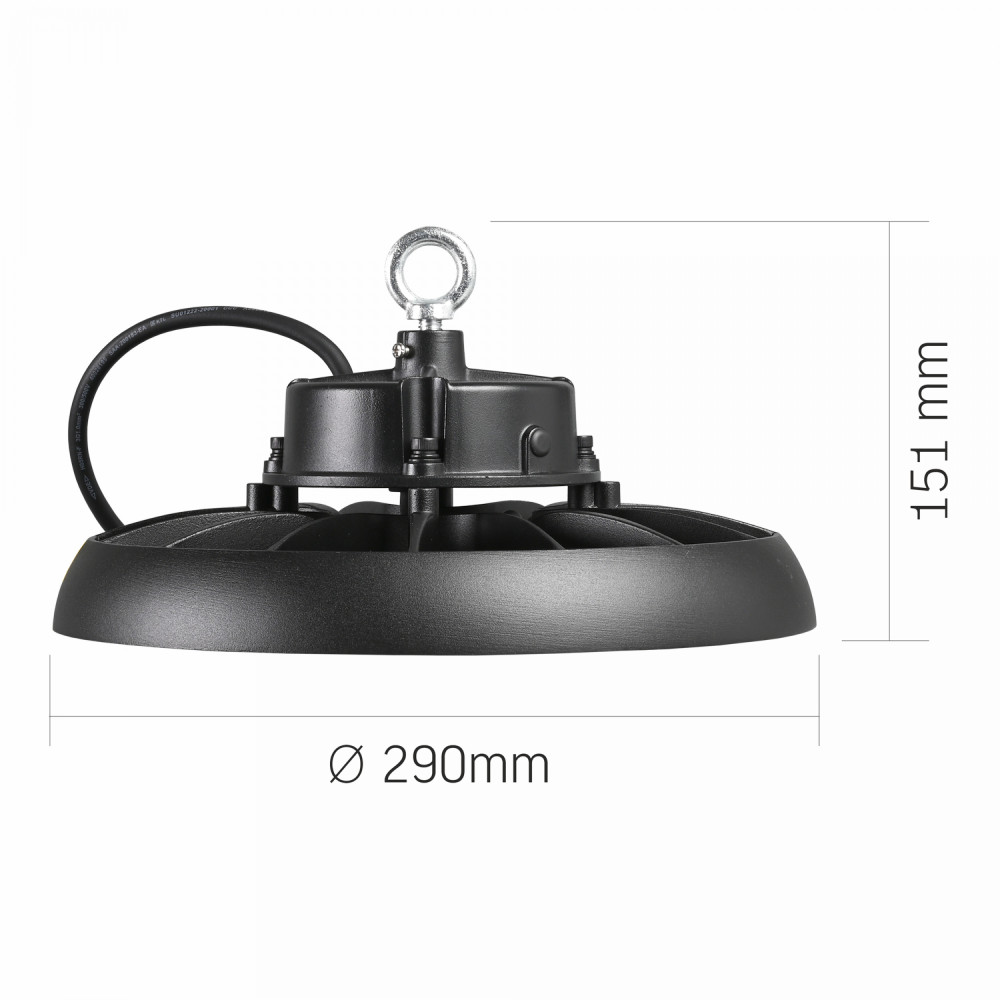 LED High Bay Light VIDEX HB01 150W 5000K 27000Lm (VL-HB01-1505B) is a high-power industrial-grade lighting fixture. It is designed to replace conventional lighting in various warehouse and production facilities, as well as in industrial lighting systems where continuous illumination is required 24/7 (not suitable for residential use). The fixture features a lightweight and durable aluminum housing. It is mounted in a suspended manner using a mounting ring, typically hung on a hook and attached to fixed supports. During prolonged operation, the device may become very hot, but it does not overheat, and its LED module provides stable, bright, flicker-free light over long periods. The dimensions of the unit are only 290×151mm. The light has an increased luminous efficacy of 180Lm/W, with a total luminous flux of 27 000 Lm. It is equipped with LEDs that deliver directional light, making it a solid alternative to outdated high-power incandescent lamps. The beam angle is 90°. The High Bay fixture VIDEX features high impact resistance (IK07) and a high level of dust and moisture protection (IP65), ensuring safe operation in environments with elevated humidity or even outdoors. For direct connection to a 220V mains supply, the fixture is equipped with a driver that ensures stable performance even during voltage fluctuations. Operating voltage range is 110–277V, 50/60Hz. This light provides significant energy savings while delivering high-efficiency, high-power illumination with a long service life and strong resistance to frequent ON/OFF cycles (25 000). Operational lifespan is 50 000 hours. The product is built to last and comes with a 3-year warranty. It contains no harmful substances.