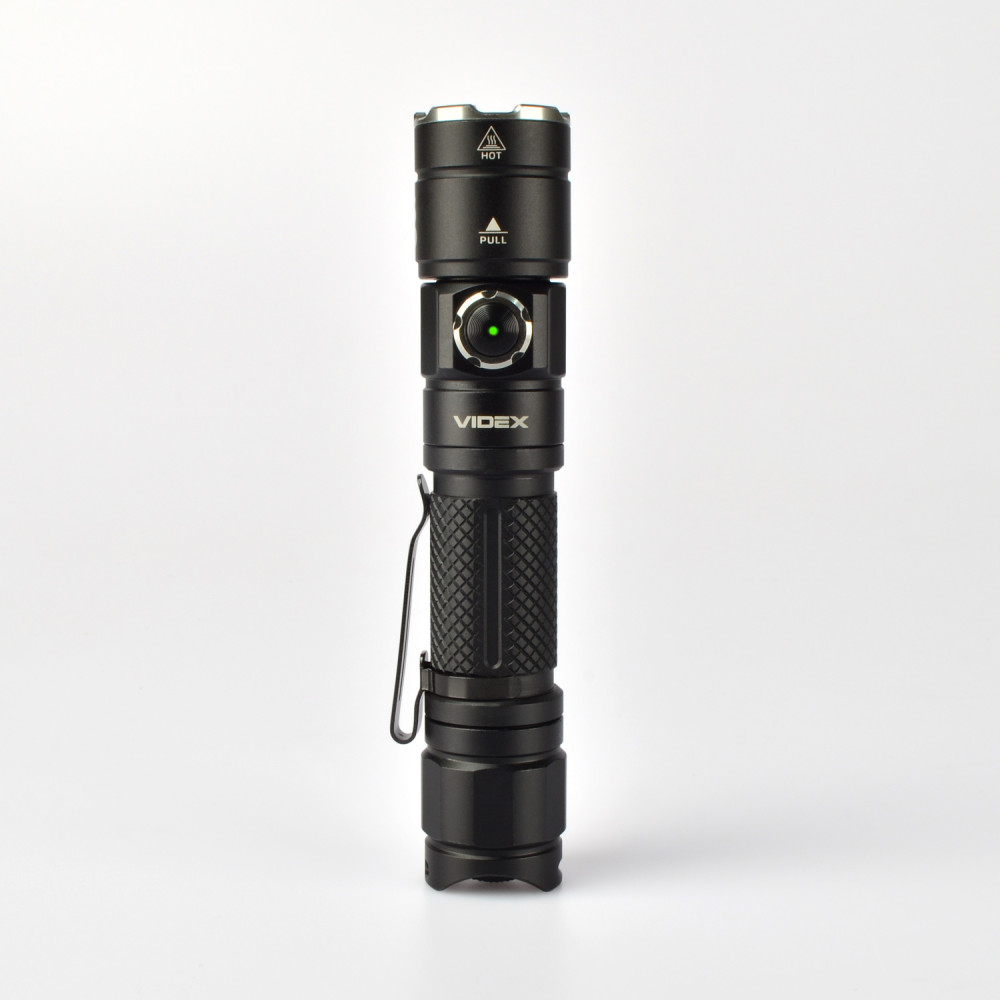 LED Portable Flashlight VIDEX VLF-A105Z 1200Lm 5000K is designed for individual use in the dark or in unlit indoor environments. The main features include tightness, a reliable housing, and long beam distance. Allows you to select the required operating mode. Maximum brightness is 1200Lm. It uses a Luminus SST40 LED, which improves the photoelectric conversion efficiency while achieving high reliability and better performance. Increase/decrease of beam projection. Convenient control using a sliding focusing ring to increase or decrease the light beam projection. The flashlight is turned off by a long press of the button. Flashlight operating modes: TURBO (Turbo mode) – maximum brightness of 1200Lm. Illumination distance reaches 215m. Operating time is 1h 30min. Luminous intensity is 11600cd. The operating time in TURBO mode is the total time tested with overheating protection enabled. HIGH (Maximum light output mode) – brightness 650Lm. Illumination distance reaches 156m. Operating time is 1h 40min. Luminous intensity is 6096cd. MIDDLE (Medium light output mode) – brightness 425Lm. Illumination distance reaches 130m. Operating time is 2h 30min. Luminous intensity is 4200cd. LOW (Minimum light output mode) – brightness 260Lm. Illumination distance reaches 104m. Operating time is 5h 20min. Luminous intensity is 2720cd. MOON (Night mode) – the longest possible operating time in this mode is 83h, generating a luminous flux of 30Lm. Illumination distance reaches 35m. Luminous intensity is 312cd. - When the flashlight is on, a long press of the button activates the SOS signal mode. - The flashlight can be locked/unlocked by double-pressing the button. - Discharge time is tested with the standard 18650 2200mAh battery and may be extended when using a higher-capacity battery. The above parameters may vary depending on environmental conditions. -Automatically memorizes the selected mode. The LED indicator on the button notifies about the battery charge level: - Steady green light at full charge (100–85%) - Flashing green light at charge level (85–50%) - Steady red light at charge level (50–25%) - Flashing red light at charge level (25–1%) Charging is available via a USB-C cable. 18650 type rechargeable batteries are used as the power source. ATTENTION! It is strictly forbidden to use the flashlight while charging. Perfectly protected and adapted for use in difficult and extreme conditions. Easily withstands mechanical loads and drops from height. It can fall from a height of 1m without damage. The durable housing also resists moisture. Protection standard – IP44 (protection against splashing water). An excellent, modern, and highly efficient flashlight will be a great companion during outdoor activities. Easy to use. Warranty is 3 years for the flashlight and 1 year for the battery.