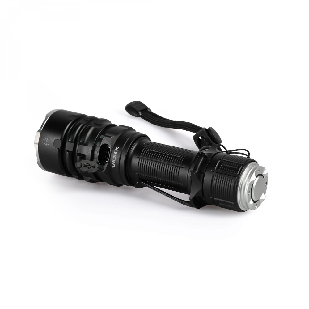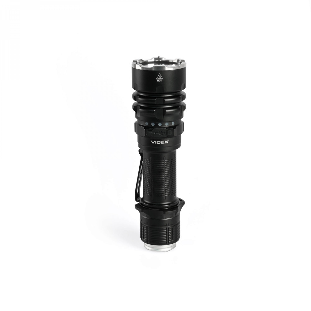 Tactical LED Flashlight VIDEX VLF-AT265 2000Lm 6500K is a powerful and functional tool that provides intense illumination in any conditions. This model is designed for use by law enforcement and military personnel. One of the primary purposes of a tactical flashlight is integration with firearms. KEY FEATURES: - High Power: The flashlight delivers a luminous flux of up to 2000 lumens, producing a bright, long-range beam with an 85° angle. It allows you to illuminate the desired area easily and reach distances up to 650m. - Comes with a pair of glass filters in red and green with a retention loop, allowing you to select the appropriate light shade as needed: Built-in WHITE light – daylight white light at 6500K, provided by a LUMINUS SFT40 LED with a maximum power of 20W, producing a high-intensity, long-range beam up to 650m; RED filter – red light preserves night vision and has a lower detection factor than ordinary white light, making it suitable for law enforcement operations or other specific situations; GREEN filter – commonly used in hunting because green light is much less noticeable to animals and birds. - Easy Operation: The flashlight features a simple button system that allows easy switching between modes and one-handed use. It has a smooth, two-level tactical button with two functions: full press for turning the flashlight on/off, and partial press for switching modes while the flashlight is on. Tactical activation is also possible with a partial press while the flashlight is off. - 4 Lighting Modes: TURBO, MIDDLE, MOON, STROBE. - Minimum Brightness MOON Mode. The MOON mode is set to 10 lumens, enough to, for example, check a map while remaining relatively discreet. - Instant Light Activation – while the flashlight is turned off, press and hold the button for rapid light activation. Partial press activates medium brightness, full press and hold activates maximum brightness. - Beam Stabilization: The flashlight has a luminous flux stabilization system that prevents brightness fluctuations and maintains a safe temperature for all components, including the battery. - Tactical Button Compatibility: Supports the use of a tactical switch (VLF-ARM-01) for extended professional military and law enforcement use. - Long Runtime. With a replaceable Li-ion 21700 4000mAh battery, the flashlight can operate up to 117 hours on minimum MOON mode. Batteries can be swapped with another 21700 or 18650 battery (adapter included). - Dual-Spring System: Dual springs made of pure elastic copper absorb recoil energy during shooting, ensuring stable contact. - Durable, Thoughtful Design: Ergonomic, reliable, and resistant to drops from up to 3 meters. Made of deeply anodized aluminum with anti-abrasive and anti-corrosion coating. - Metal Clip: Allows attachment to clothing or backpacks; removable if needed. - Glass Breakers: Front ring equipped with silicon nitride glass breakers, stronger than tungsten, for emergency glass breaking for life-saving situations (evacuation in case of fire, an emergency situation on the road, etc.). - High Light Transmission Glass: Optical system equipped with hardened polarized glass with high light transmittance. Rubber bumpers protect the glass from impacts. - Waterproof: IP68 ingress protection allows resistance to rain, splashes, and short-term submersion up to 2 meters. - USB-C Port: Hidden under a protective rubber cover; supports FAST CHARGE protocol with 2.5-hour charging time. ATTENTION! Do not use the flashlight while charging! - Anti-Roll Tactical Ring. Prevents rolling and includes a hole for wrist strap attachment. - Battery Level Indicator. 5-segment indicator, each representing 20% charge. Blinking segment indicates low battery. PACKAGE CONTENTS: 1. Flashlight VLF-AT265 2. Li-ion 21700 4000mAh battery 3. USB-C charging cable 4. Wrist strap 5. Steel clip 6. Tactical ring 7. Color filters (green and red) 8. Spare O-rings 9. 18650 battery adapter 10. User manual Flashlight weight without battery is 163g ± 5g. Flashlight weight with standard battery is 228g. Warranty is 3 years on the flashlight, 1 year on batteries.