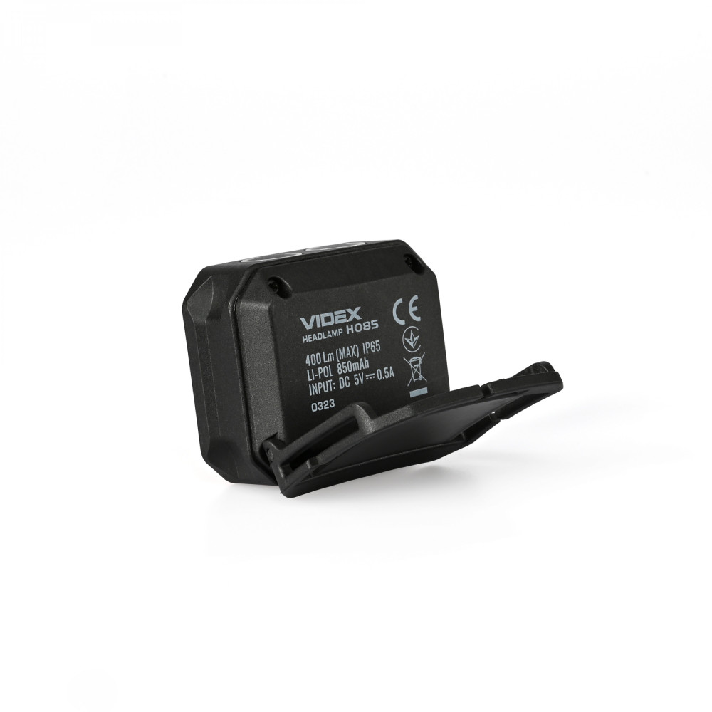 LED Headlamp VIDEX VLF-H085-OR is designed for individual use during nighttime or in unlit indoor environments. It is specially developed for outdoor activities, camping, and sports such as running, trail running, and hiking. Maximum brightness – 400Lm. The adjustable tilt angle of the mount allows you to choose a convenient lighting angle. The head strap is made of durable, soft-textured material, ensuring comfortable use. FLASHLIGHT OPERATION - Press the «MAIN LIGHT» button to turn on the main light, switch modes cyclically, and turn the light off. - Press the «COB LIGHT» button to turn on the near light, switch between near-light or red-light modes cyclically, and turn the light off. - Long press (0.5 seconds) of any button while the light is on – turns the light off. Note: The flashlight automatically remembers the last selected lighting mode and activates it the next time it is turned on. FLASHLIGHT MODES - HIGH (Maximum-power white light): 330Lm brightness. Lighting distance 110m. Runtime 3h. Luminous intensity 3000cd. - LOW (Low-power white light): 80Lm brightness. Lighting distance 50m. Runtime 5h. Luminous intensity 670cd. - FLASH (main flashing light): 330Lm brightness. Lighting distance 110m. Runtime 3h. Luminous intensity 3000cd. - MAIN + COB (main + near light at maximum power): 400Lm brightness. Lighting distance 105m. Runtime 1h 30min. Luminous intensity 2800cd. - COB HIGH (near light at maximum power): 200Lm brightness. Lighting distance 22m. Runtime 2h 30min. Luminous intensity 120cd. - COB LOW (near light at low power): 30Lm brightness. Lighting distance 8m. Runtime 8h. Luminous intensity 15cd. - RED ON (red light at maximum power): 15Lm brightness. Lighting distance 7m. Runtime 3h. Luminous intensity 12cd. - RED FLASH (flashing red light): 15Lm brightness. Lighting distance 7m. Runtime 3h. Luminous intensity 12cd. BATTERY LEVEL INDICATOR When the light is off, press and hold any button for 1 second to check the battery level. The indicator will stay on for 3 seconds. The battery status is also continuously displayed when the light is on: 5 bars – charge ≤100% 4 bars – charge ≤80% 3 bars – charge ≤60% 2 bars – charge ≤40% 1 bar – charge ≤20% 1 bar flashing – battery discharged. The headlamp has a built-in 850 mAh Li-pol battery. The built-in battery can be replaced independently only after the warranty period ends. The replacement process is described in the manual. Note that replacing the battery yourself during the warranty period voids the warranty. USB-C charging is available. WARNING! It is strictly forbidden to use the flashlight while it is charging. The device is well protected and adapted for use in harsh and extreme conditions. It easily withstands mechanical stress and drops from a height of up to 2m. It offers full protection against dust, heavy rain, and splashes. Protection rating – IP65. This excellent, modern, and highly efficient flashlight will be a great companion during outdoor activities. Easy to use. Warranty is 2 years (1 year for the battery).