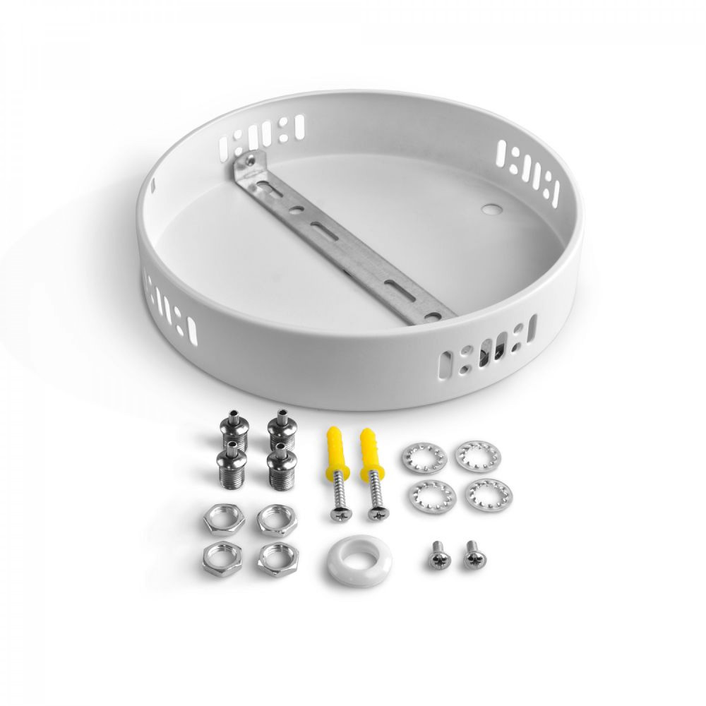 This set is one of the elements of the set for suspended mounting of LED panels and frame type LED panels. At one end the panel is attached, and at the other end 4 cables (not included) are attached together to the round base, which in turn is attached to the ceiling in an overhead manner.
